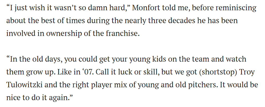 Nostalgia is a mind killer, a virus that infects your very nature until you will concede any belief to a lie that it used to be better. The world moves one direction, forward. It’s funny that those that say “if you don’t learn history it is doomed to repeat” are often the ones saying “please history repeat yourself my god I just need you to repeat yourself so bad”. The belief that the Rockies can repeat 2007 isn’t just bad because it isn’t based in the reality of the circumstances that created 2007, it’s bad because you shouldn’t be trying to recreate anything. The best way to succeed in a new world is to adapt yourself to it. It’s the fundamental lesson of life itself! But if you’re Dick Monfort, you are begging Manfred to turn back the clock rather than understanding you are in a new world and need to adapt to it’s experience.